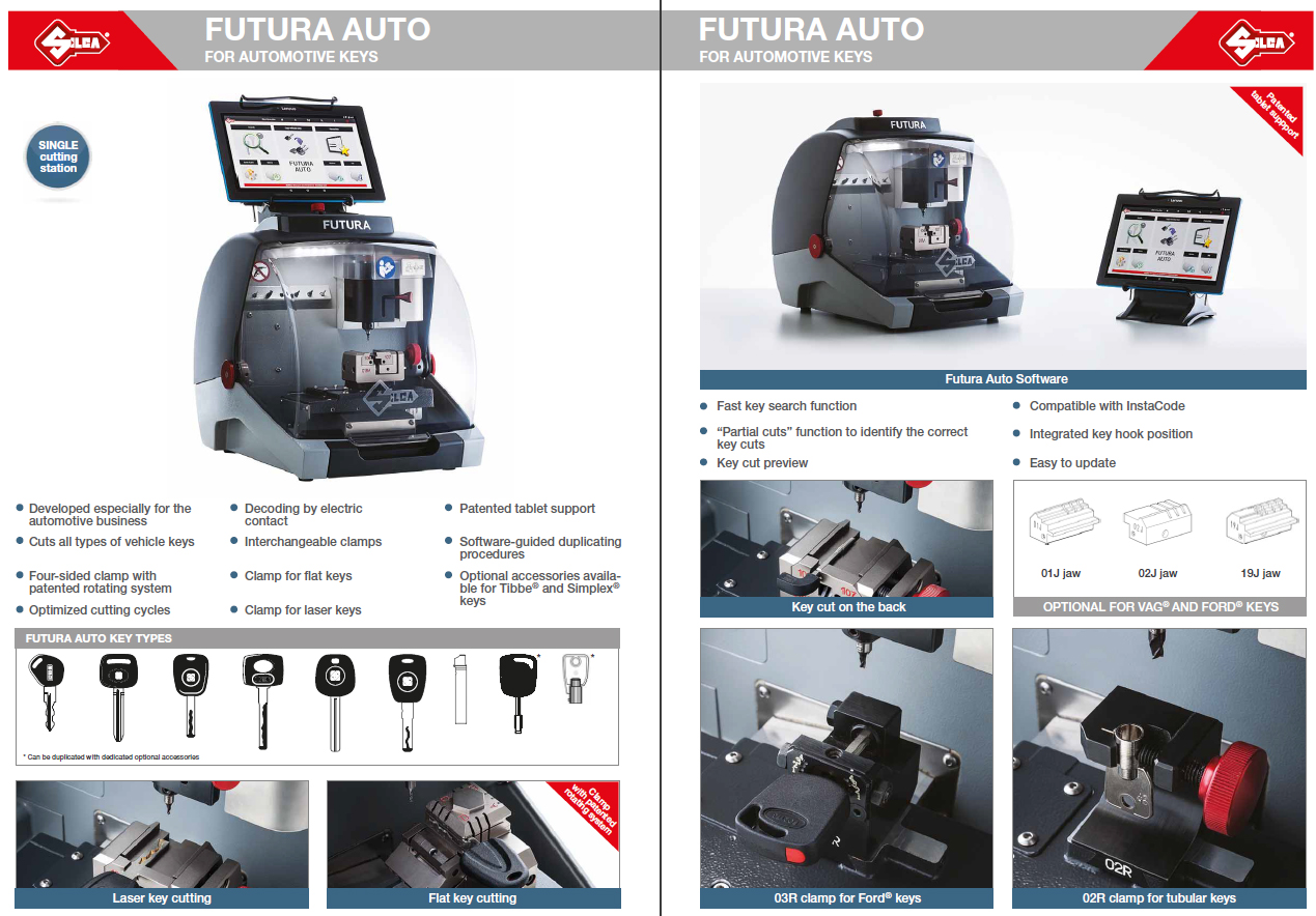 Futura Auto este o mașina de tăiat chei electronică, ușor de utilizat cu tabletă integrată, dezvoltată pentru duplicarea tuturor tipurilor de chei auto. De asemenea, poate tăia cheile pentru motociclete, microcar, autoutilitare și camioane și cele mai multe chei complementare utilizate pentru încuietori, capac pentru benzină, cutii pentru mănuși și rafturi pentru acoperiș.